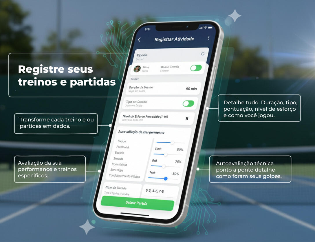 Mais do que um app, é o seu treinador pessoal com inteligência artificial, desenvolvido para quem vive os esportes de raquete.