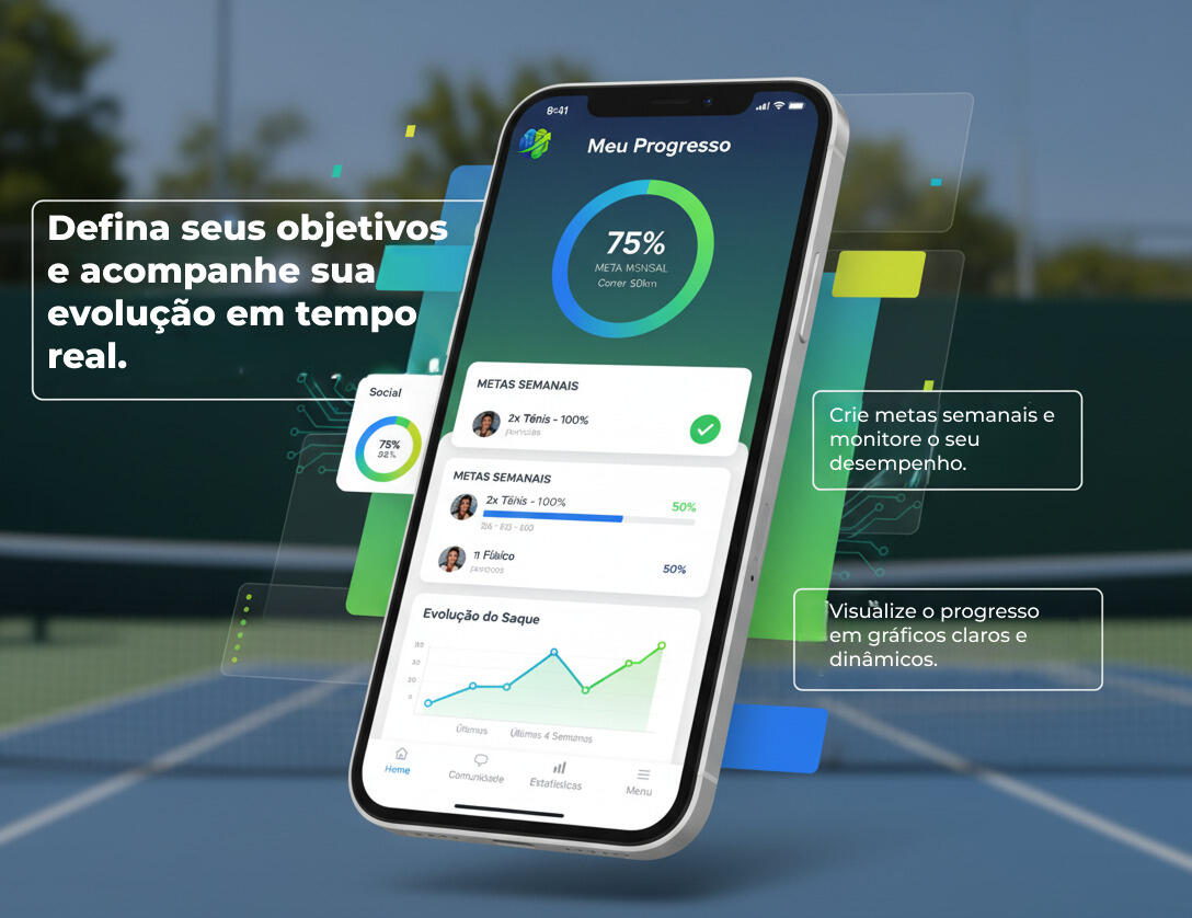 Estabeleça objetivos (ex: “jogar 3x por semana” ou “melhorar o saque para 8/10”) e acompanhe sua evolução com gráficos que ficam fáceis de entender. A cada treino registrado, você vê o avanço e entende claramente sua evolução.